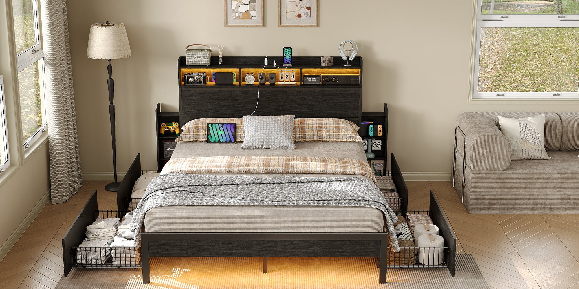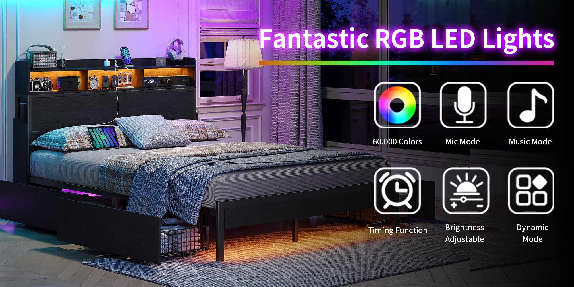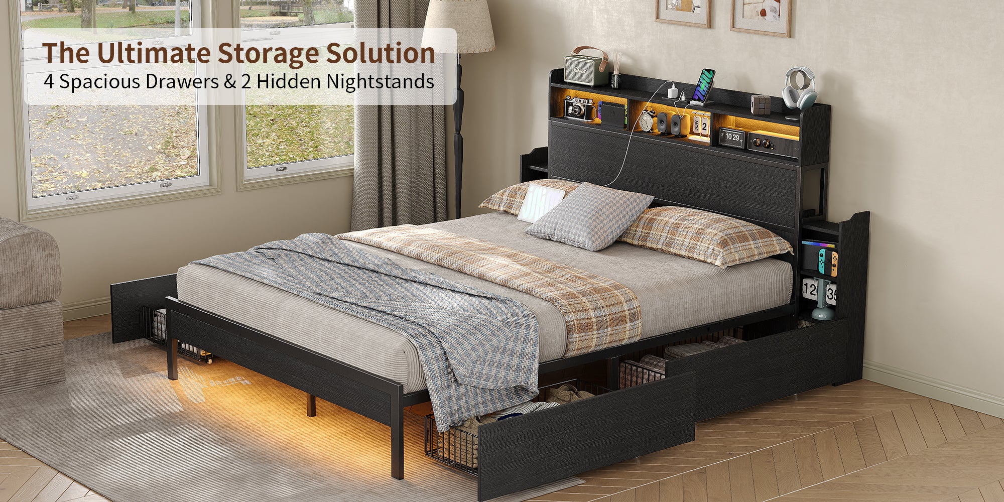 Yanosaku US - BF015 Full/Queen/King Bed Frame with 2 Hidden Nightstands, 4 Drawers, RGB Lights & USB Charging, No Box Spring,Black. - VektayaFurnitureUS-BF015-BL-F