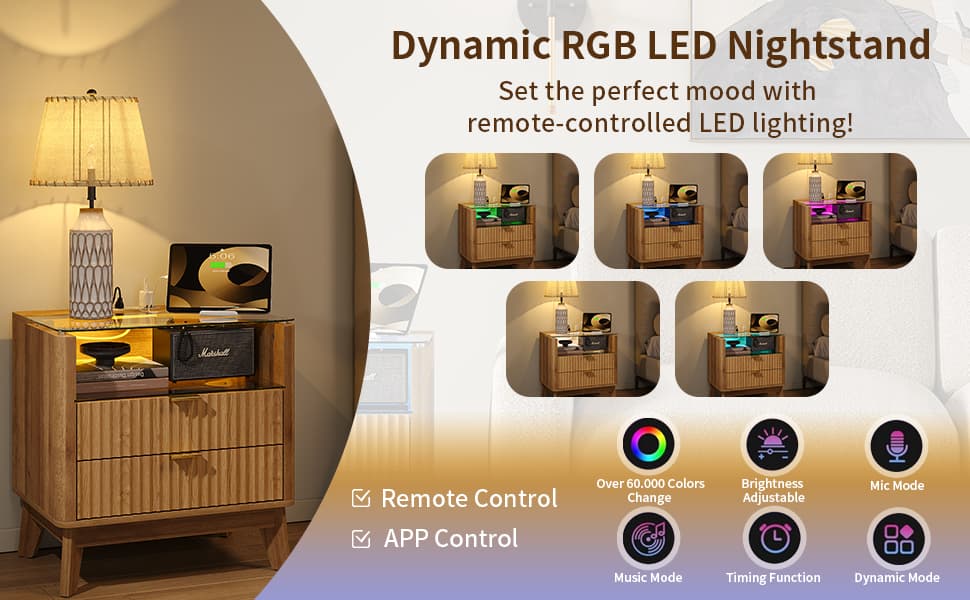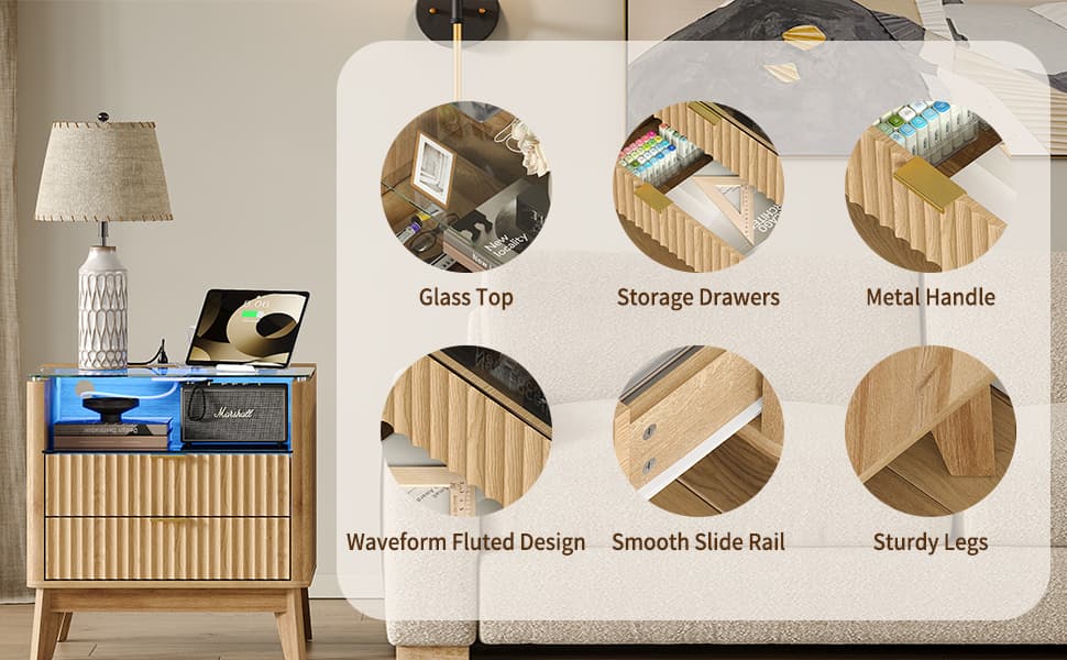 Yanosaku NS003 - NR 23" Nightstand with Charging Station, Fluted LED End Table with Drawers, Oak - Yanosaku SotreFurnitureNS003-NR-1