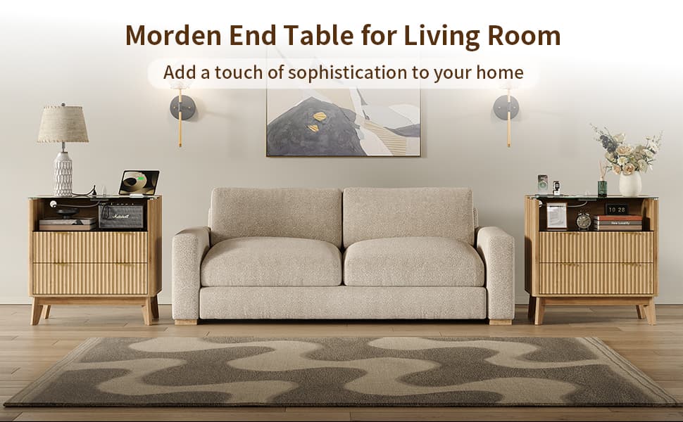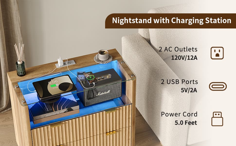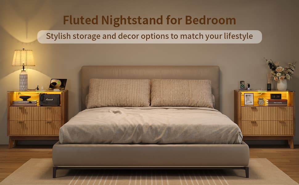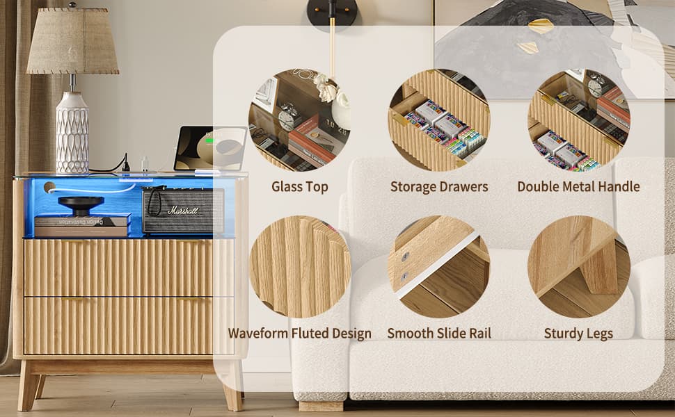 Yanosaku NS004 - NR 31" Nightstand with Charging Station, Fluted LED End Table with Drawers, Oak - Yanosaku SotreFurniture