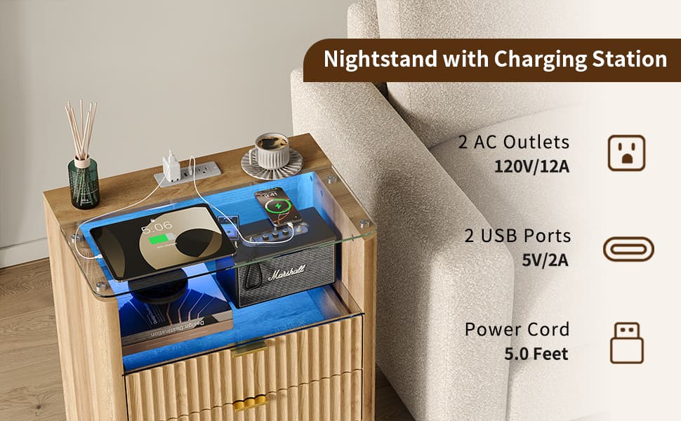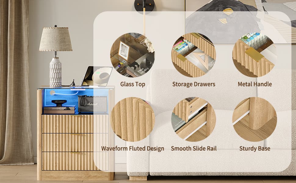 Yanosaku NS005 - NR 23" Nightstand with Charging Station, Fluted LED End Table w/ 3 Drawers, Oak - Yanosaku SotreFurniture