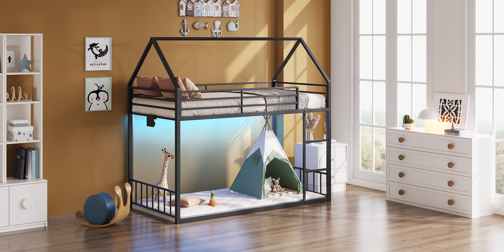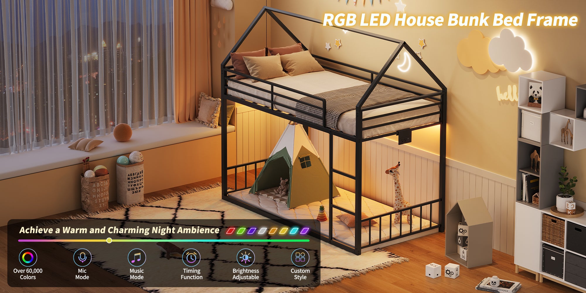 Vektaya US - BF019 - BK - T Twin Bunk Bed Frame with Charging Station & RGB LED, Easy Assembly, Storage Space, House Metal Frame with Ladder - VektayaFurnitureUS-BF019-BK-T
