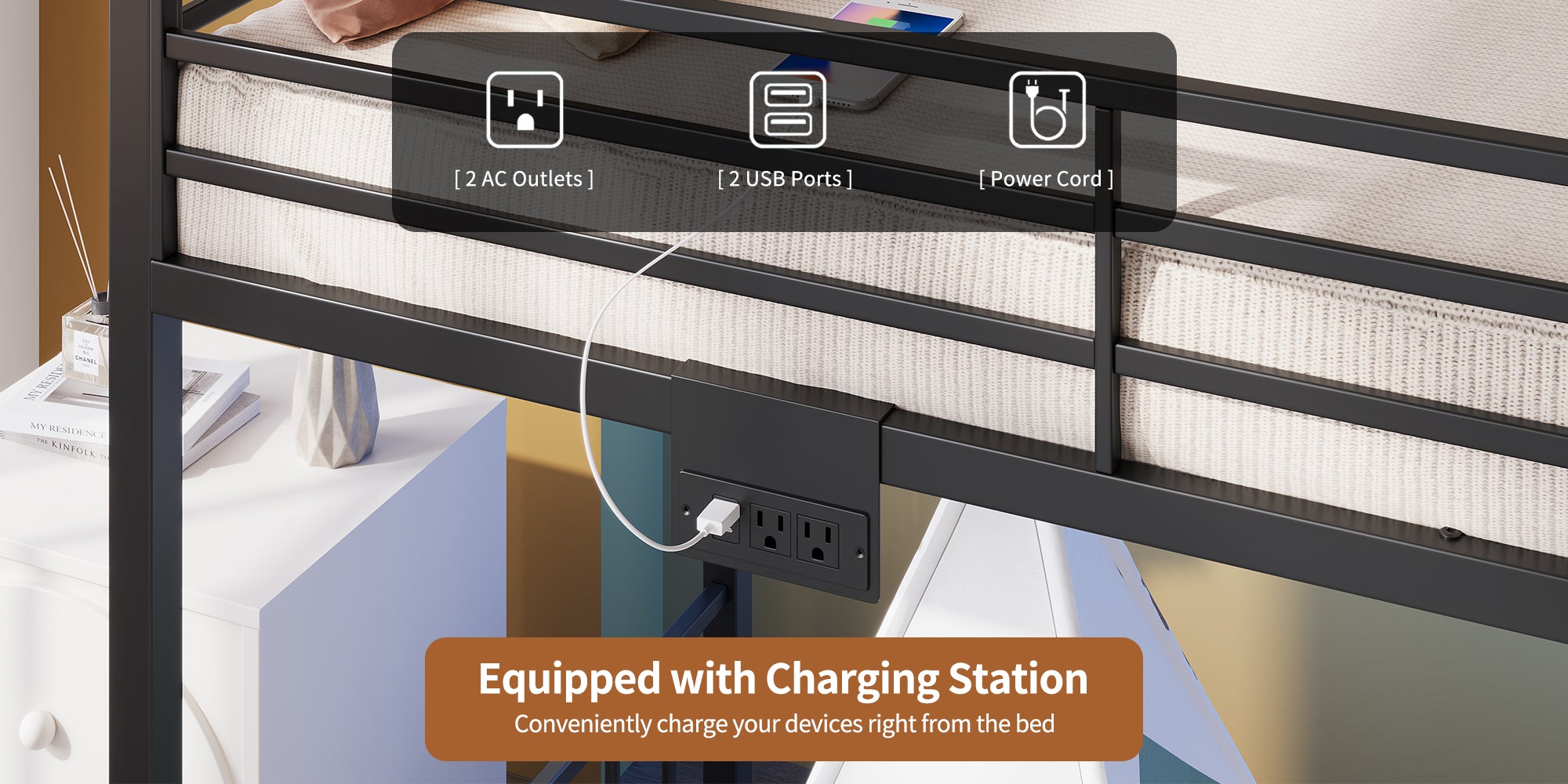 Ausgestattet mit integrierten Steckdosen zum Aufladen von Handys, Tablets oder Nachtlichtern, sorgt es für Ordnung und Übersichtlichkeit am Bett.