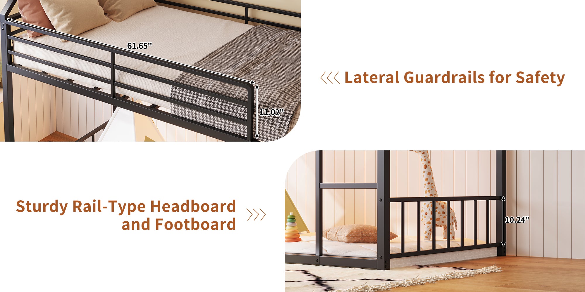 Ein verstärkter Metallrahmen gewährleistet starke Stabilität und sicheren Halt, und hohe Schutzgitter sorgen für sicheren Schlaf im oberen Bett.