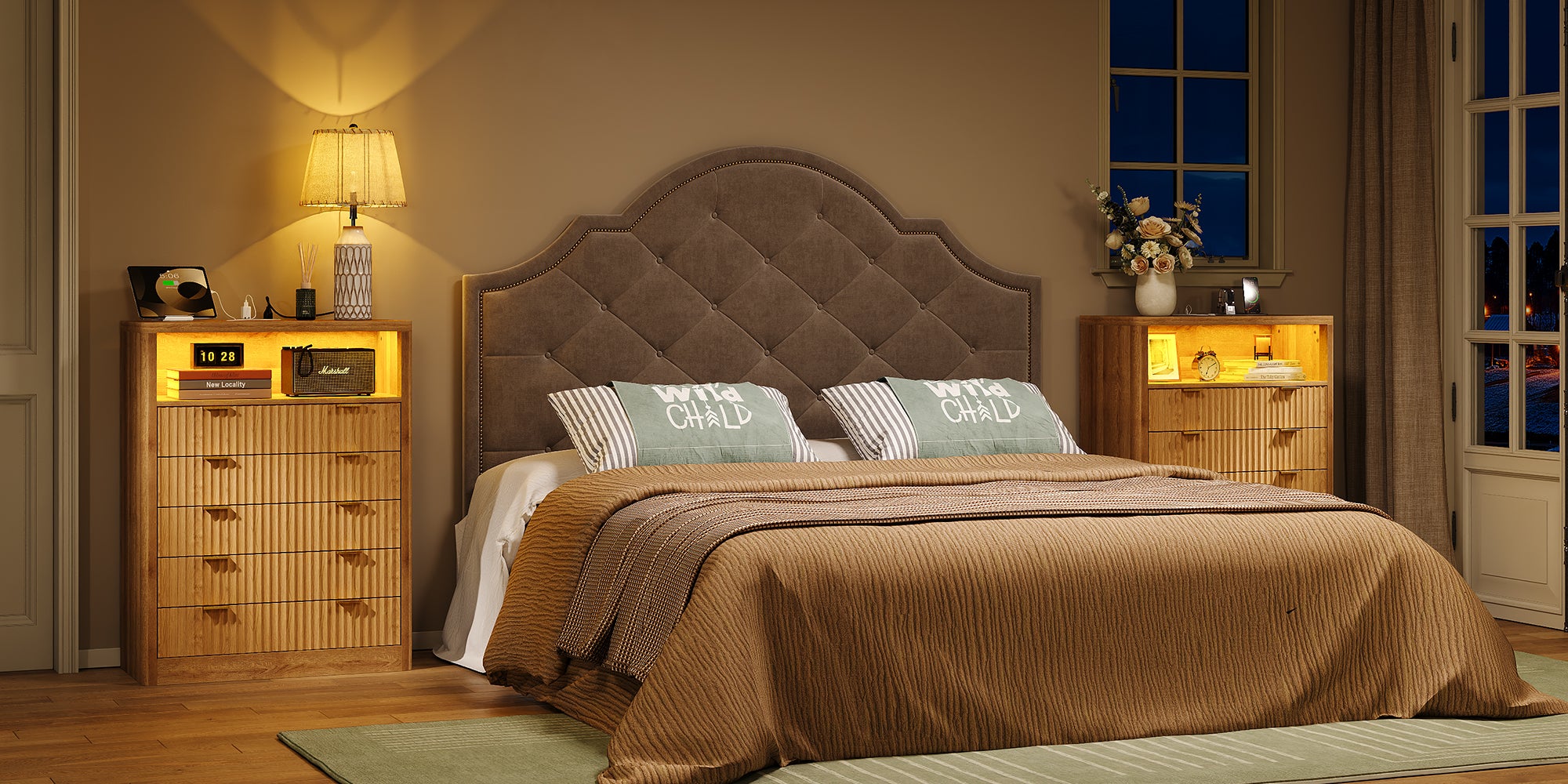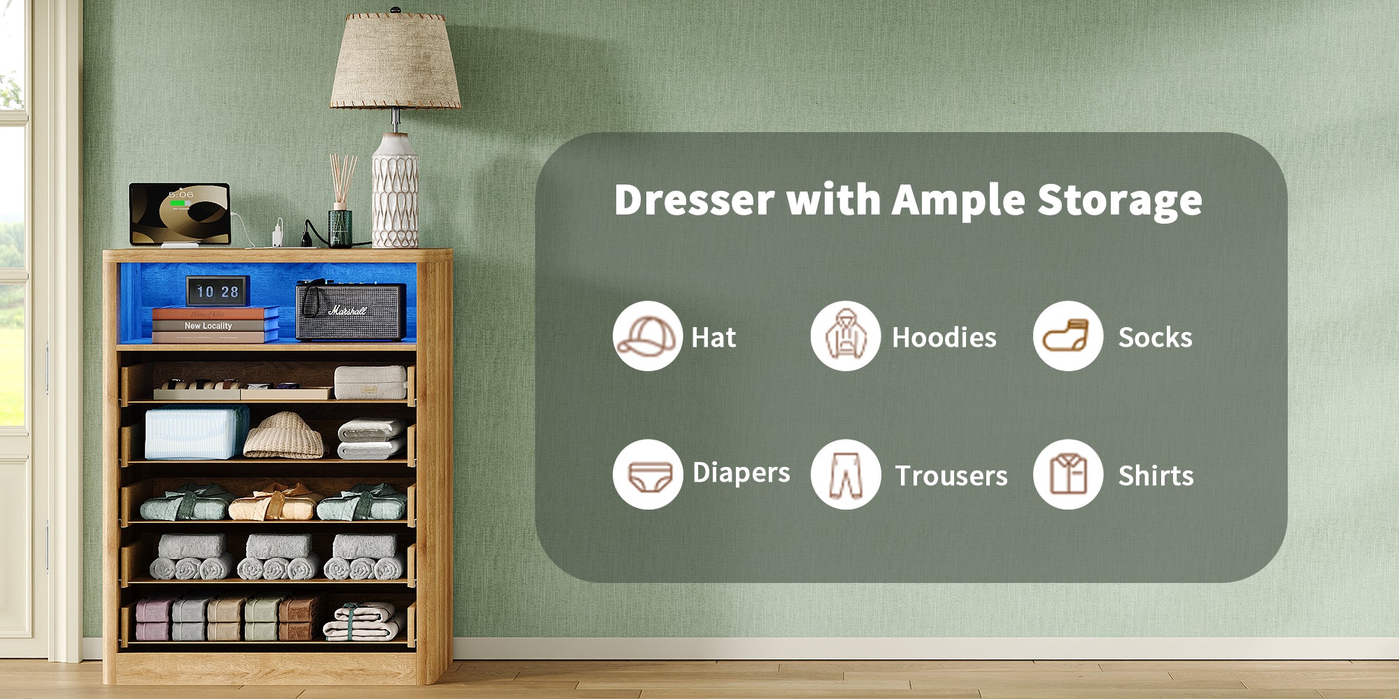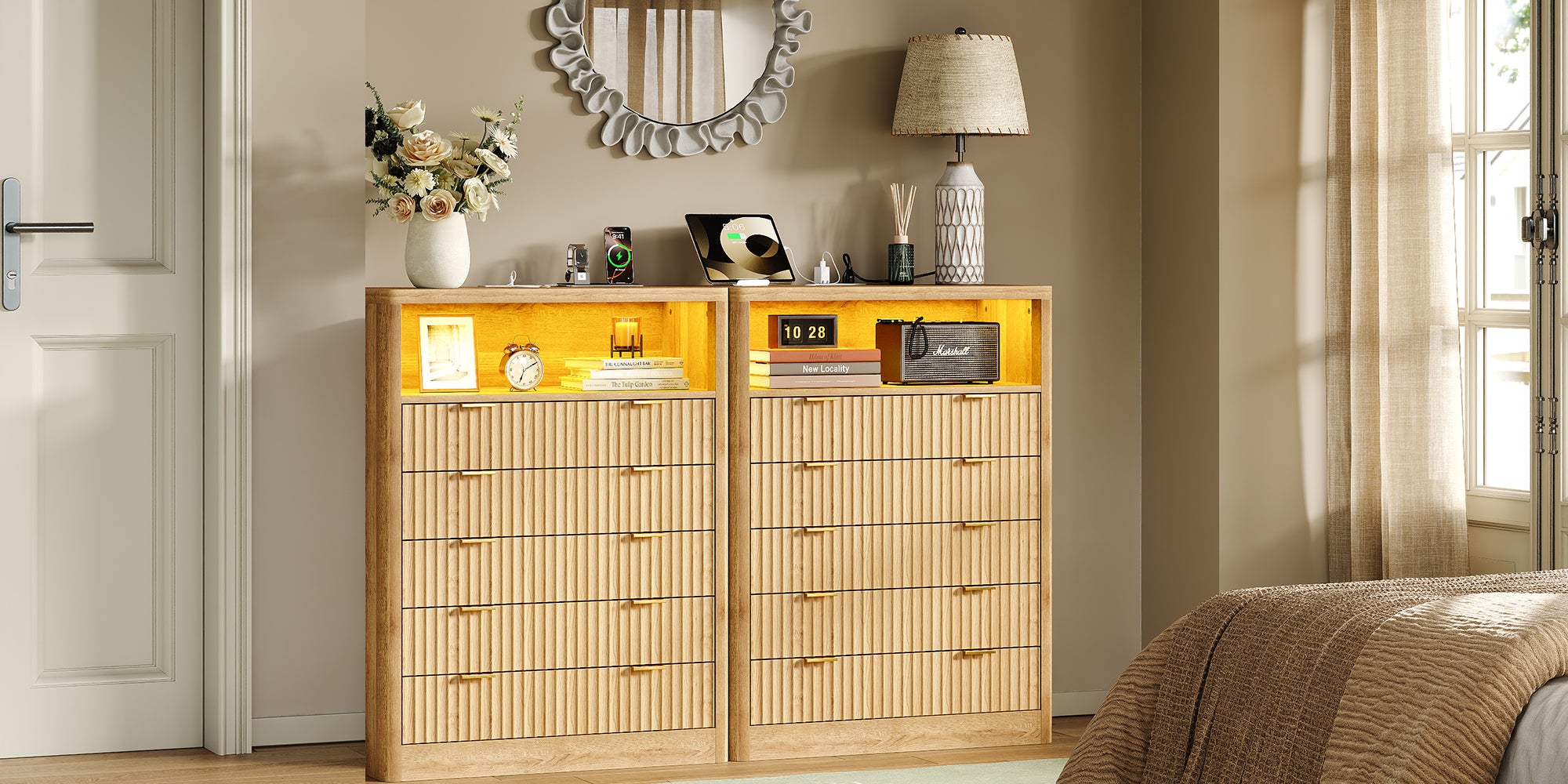 Vektaya US - NS010 - NR Fluted Nightstand with LED & Charging Station, 5 - Drawer Tall Organizer, Oak - VektayaFurnitureUS-NS010-NR-1
