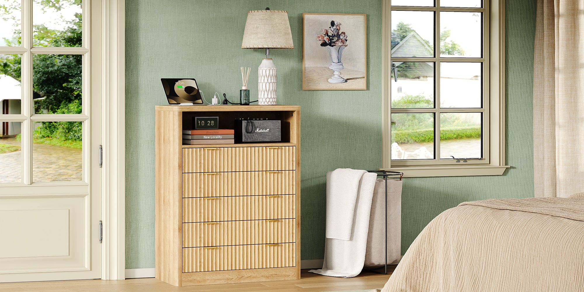 Dieser geriffelte Nachttisch bietet 5 breite Schubladen und eine große Ablagefläche für Bücher, Hautpflegeprodukte und Dinge des täglichen Bedarfs.