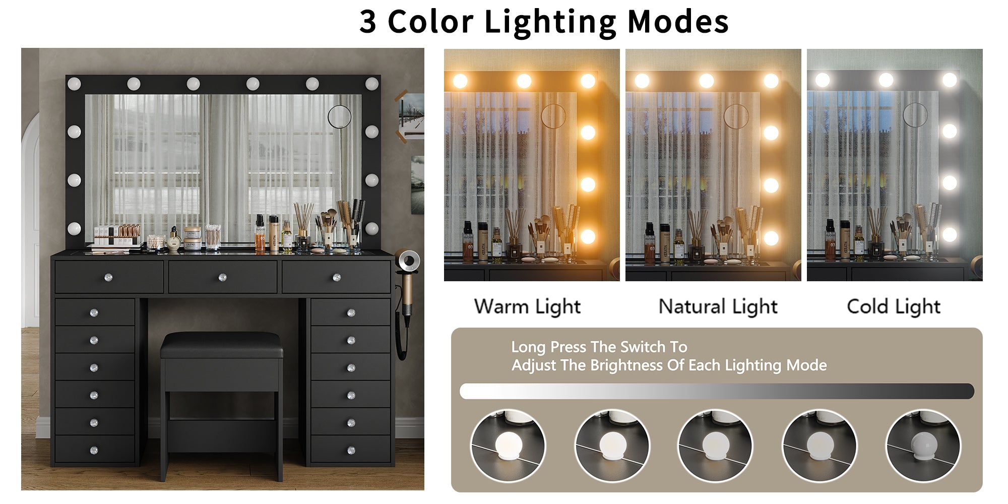 3 atemberaubende Beleuchtungsoptionen: Verwandeln Sie Ihre Beauty-Routine mit unserem Schminktisch, ausgestattet mit einem großen HD-Spiegel und 12 LED-Lampen. Wählen Sie aus 3 lebendigen Farbmodi (warm, neutral und kühl) mit einstellbarer Helligkeit, damit Sie bei jedem Anlass perfekt aussehen – egal ob Sie sich zu Hause schminken, sich für einen Salonbesuch vorbereiten oder live streamen.