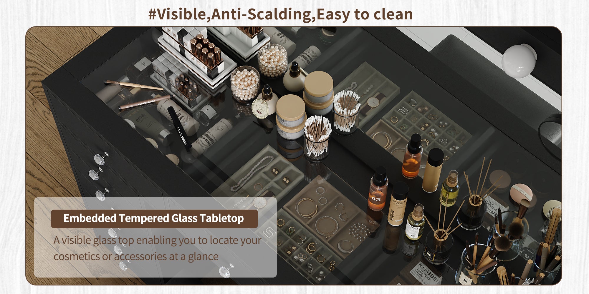 Großzügiger Stauraum für Ihre Kosmetikartikel: Schluss mit unordentlichen Schminkschubladen! Die vergrößerte Ablagefläche bietet Ihnen mehr Platz für Ihr Make-up und sorgt für ein makelloses Erscheinungsbild. Durch die Glasplatte können Sie Ihre Halsketten und Schmuckstücke in der obersten Schublade bewundern. Unser Schminktisch verfügt über 15 geräumige Schubladen und bietet somit ausreichend Platz für all Ihre Kosmetik-, Haut- und Haarpflegeprodukte.