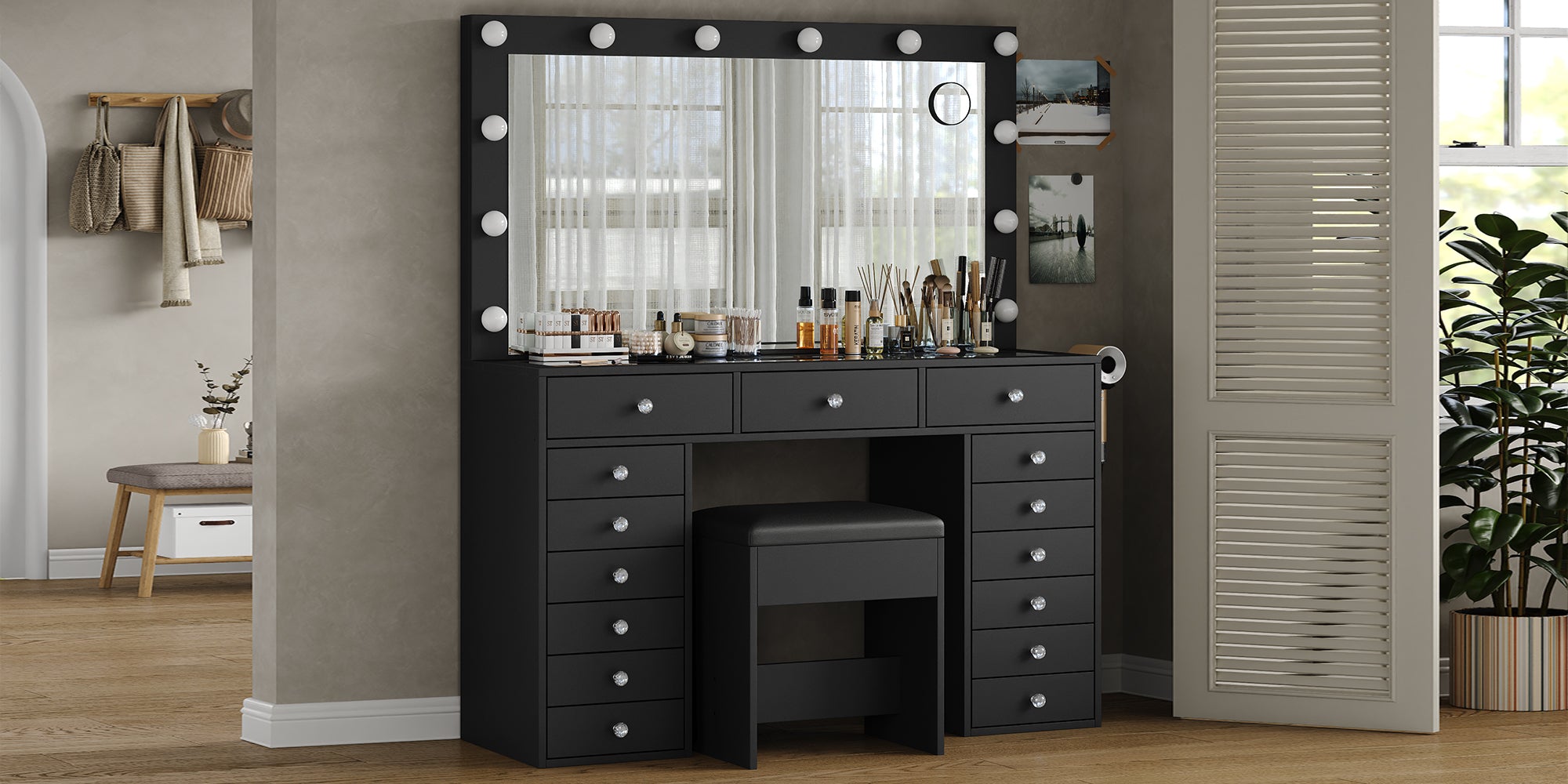 Vektaya US-VD019 Schminktisch fürs Schlafzimmer mit LED-Spiegel, 15 Schubladen