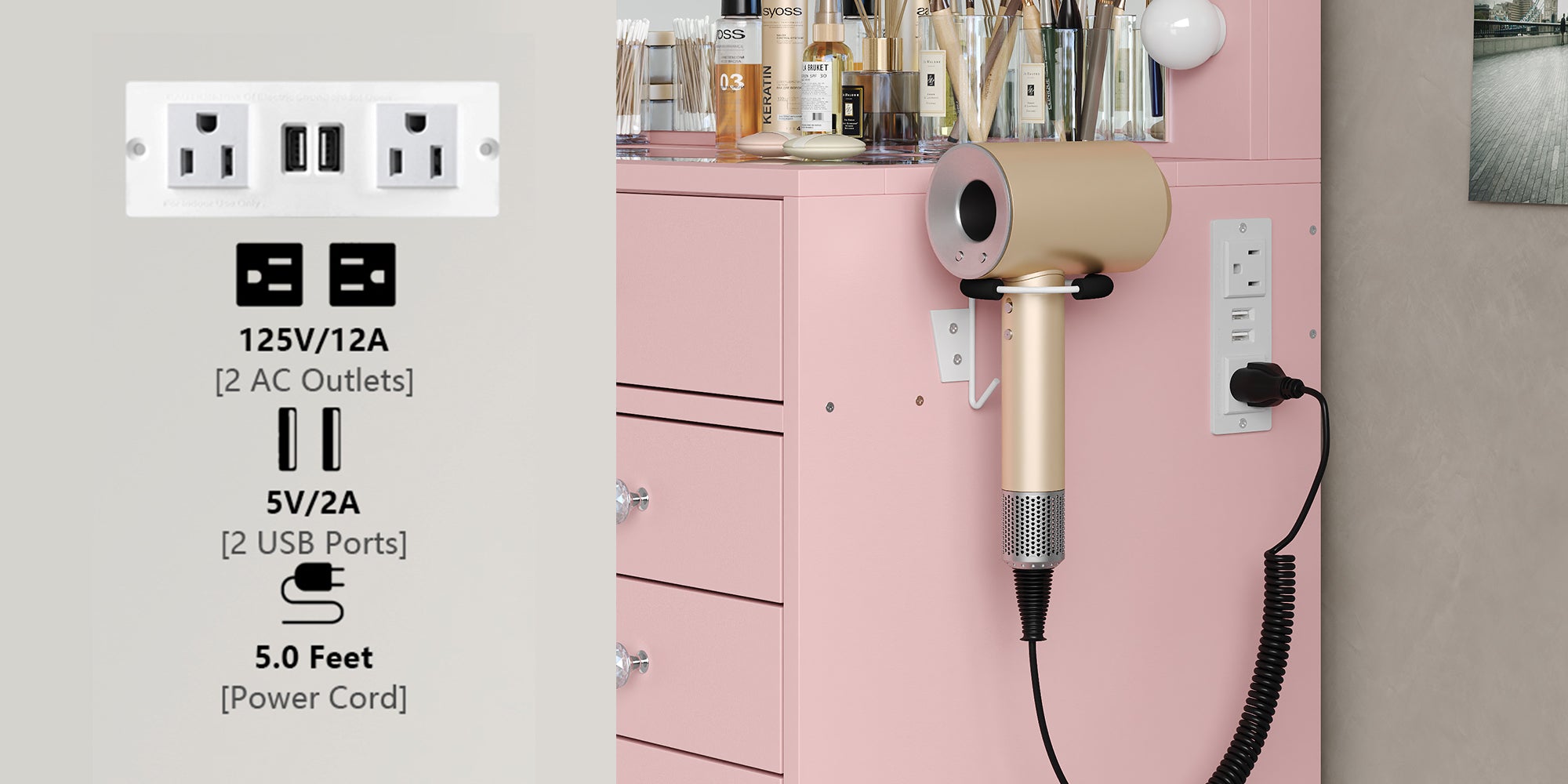 Praktische Powerstation: Dank der integrierten Steckdose mit separater Haartrocknerablage, zwei Standardsteckdosen und zwei USB-Anschlüssen bleiben Ihre Geräte stets geladen und verbunden. Dieser Schminktisch ermöglicht es Ihnen, Ihre Geräte oder Styling-Tools aufzuladen, während Sie mühelos Ihren perfekten Look kreieren.