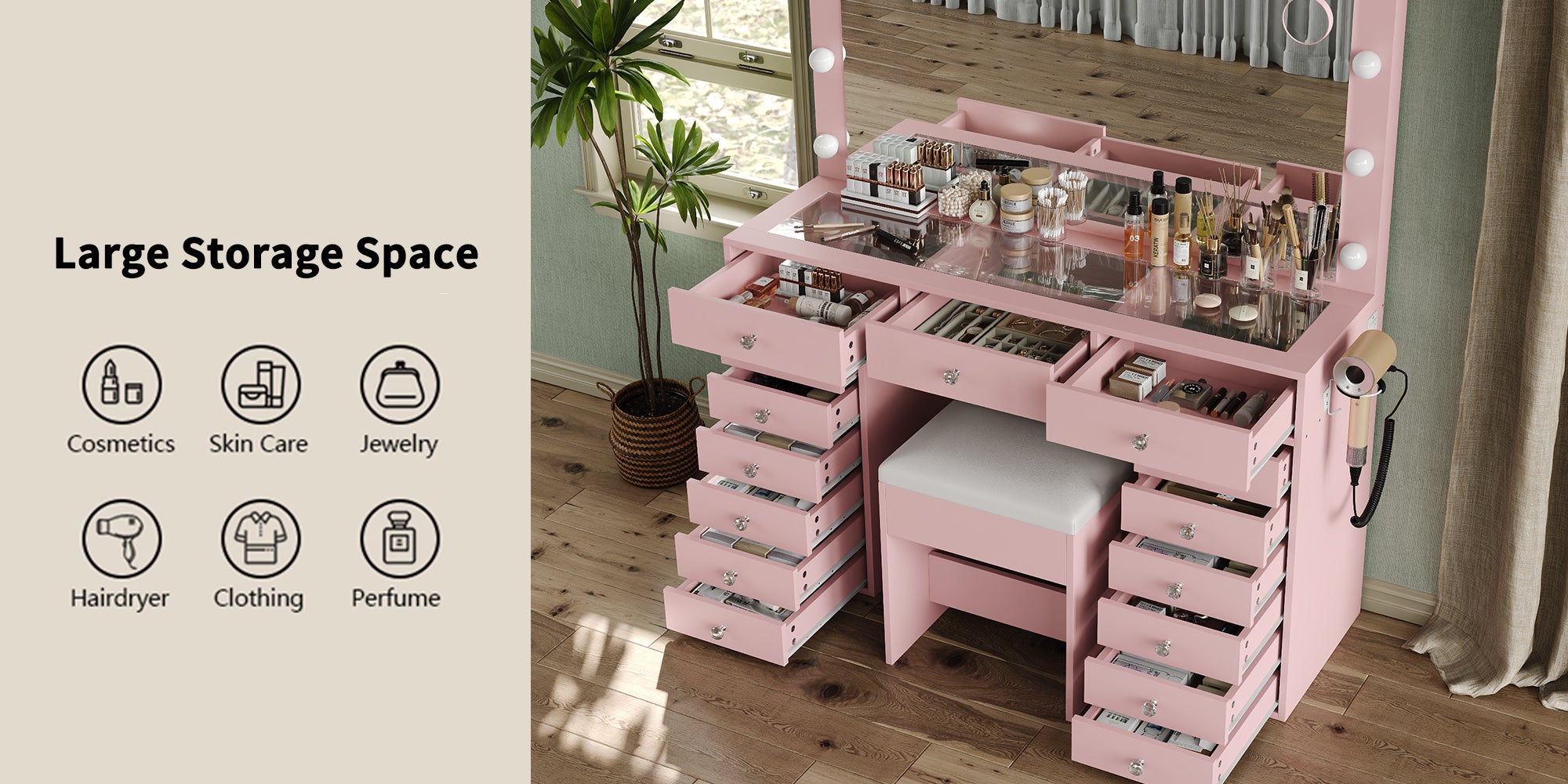 Yanosaku VD019 Bedroom Makeup Vanity desk with LED Mirror, 15 Drawers - Yanosaku SotreFurnitureVD019 - WH