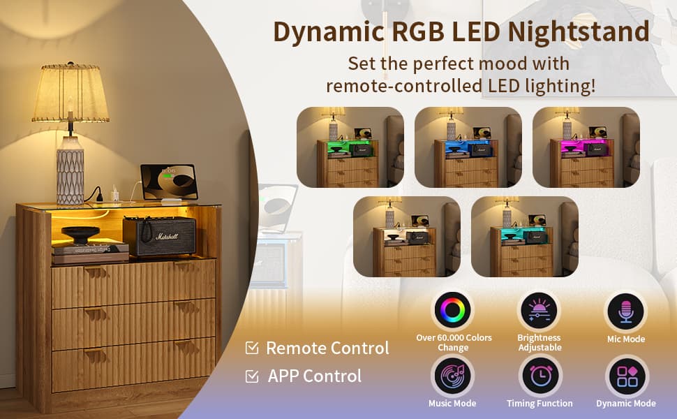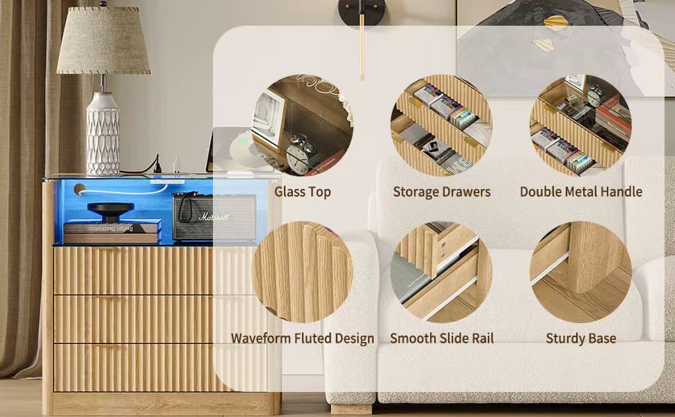 Yanosaku NS006 - NR 31" Nightstand with Charging Station, Fluted LED End Table w/ 3 Drawers, Oak - Yanosaku SotreFurnitureNS006-NR-1