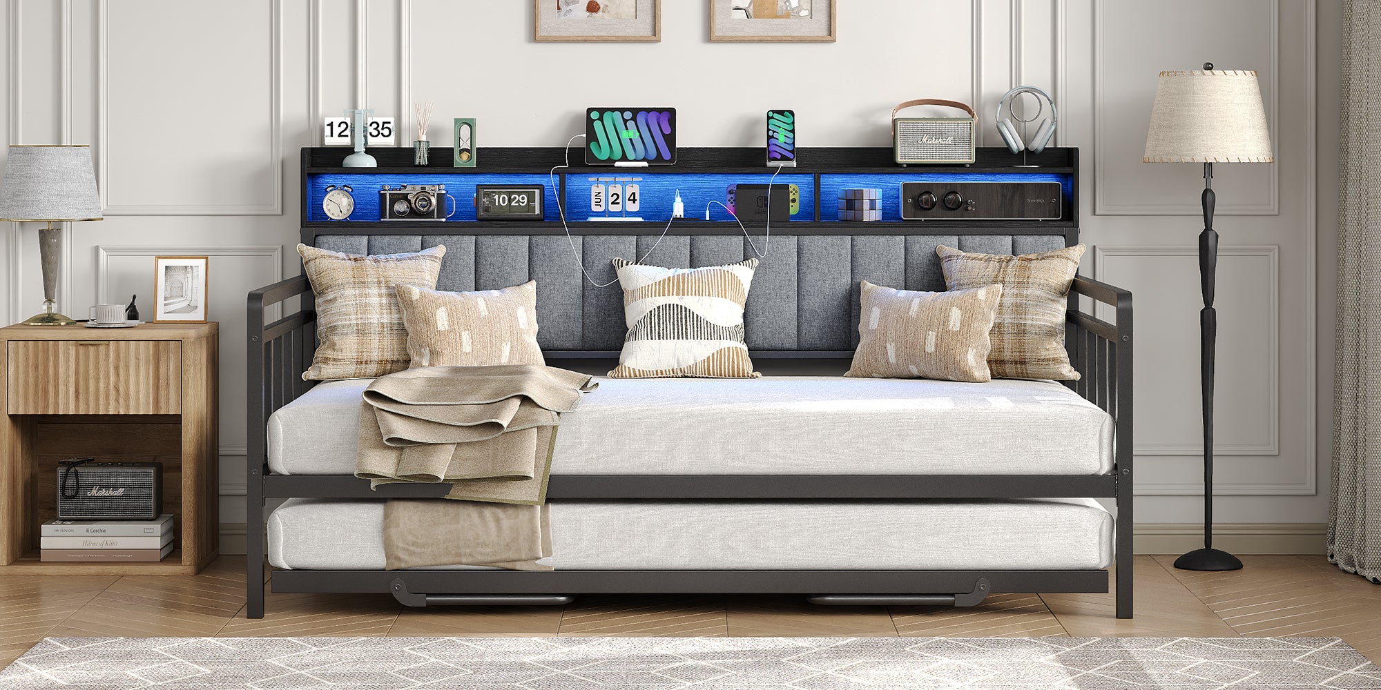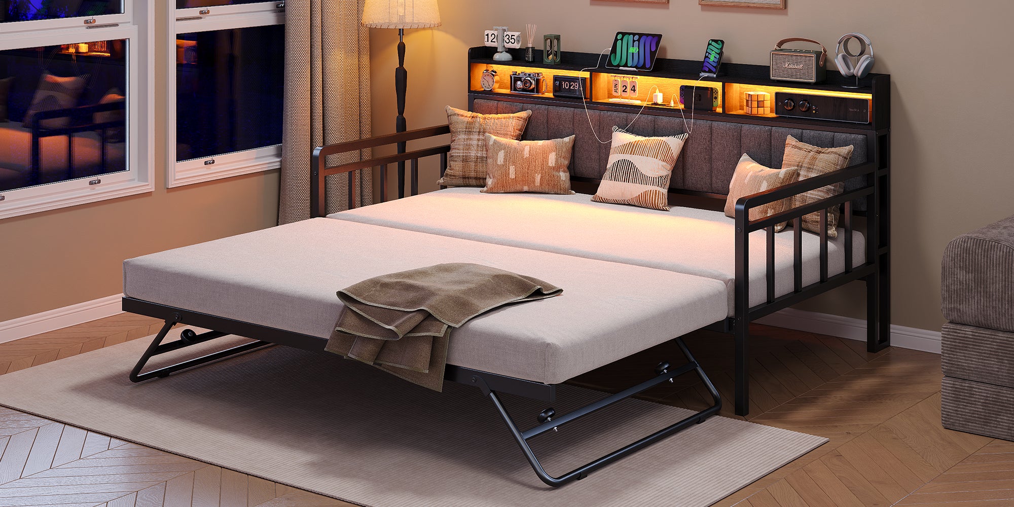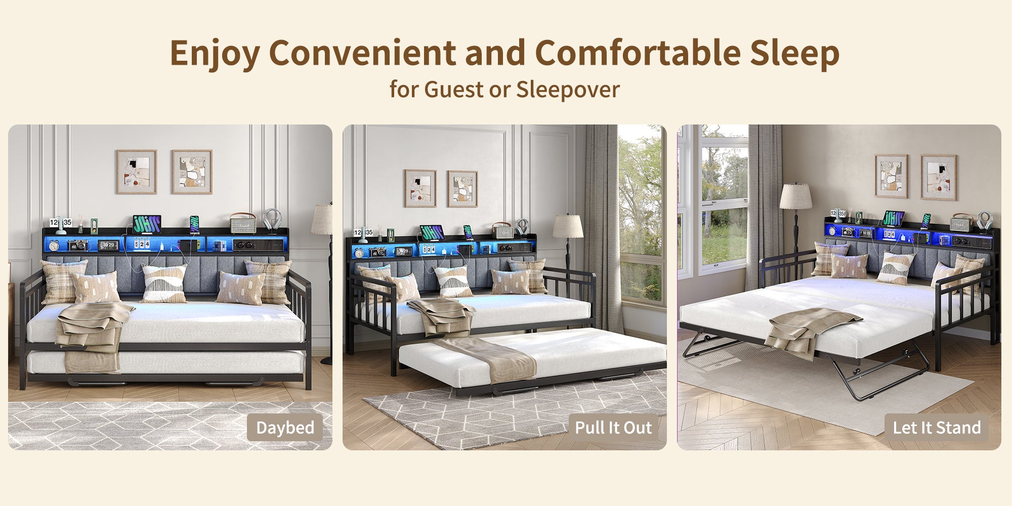Iluminación LED RGB ambiental: los LED RGB integrados con más de 60,000 opciones de color le permiten personalizar la iluminación LED de su cama, este diván con cama nido es perfecto para leer, un cálido resplandor nocturno o un ambiente de entretenimiento vibrante.