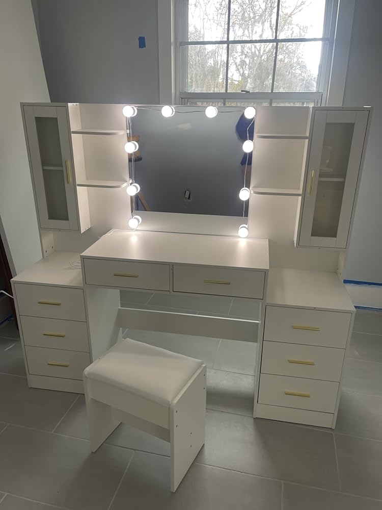 In love with this vanity it is very spacious and beautiful. There is a lot of pieces to put together so be prepared for that when buying because I was not. Took me 2 days to put it al together but it was definitely worth it! Overall 10/10 recommend.