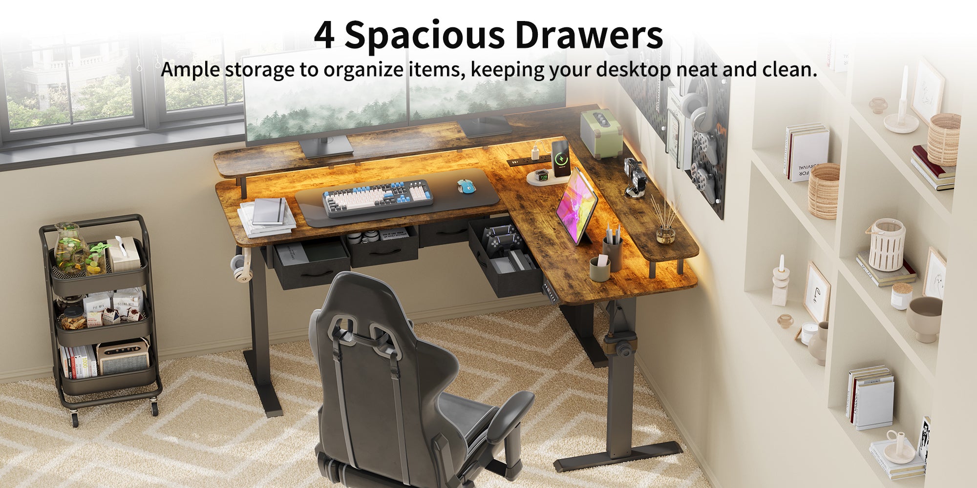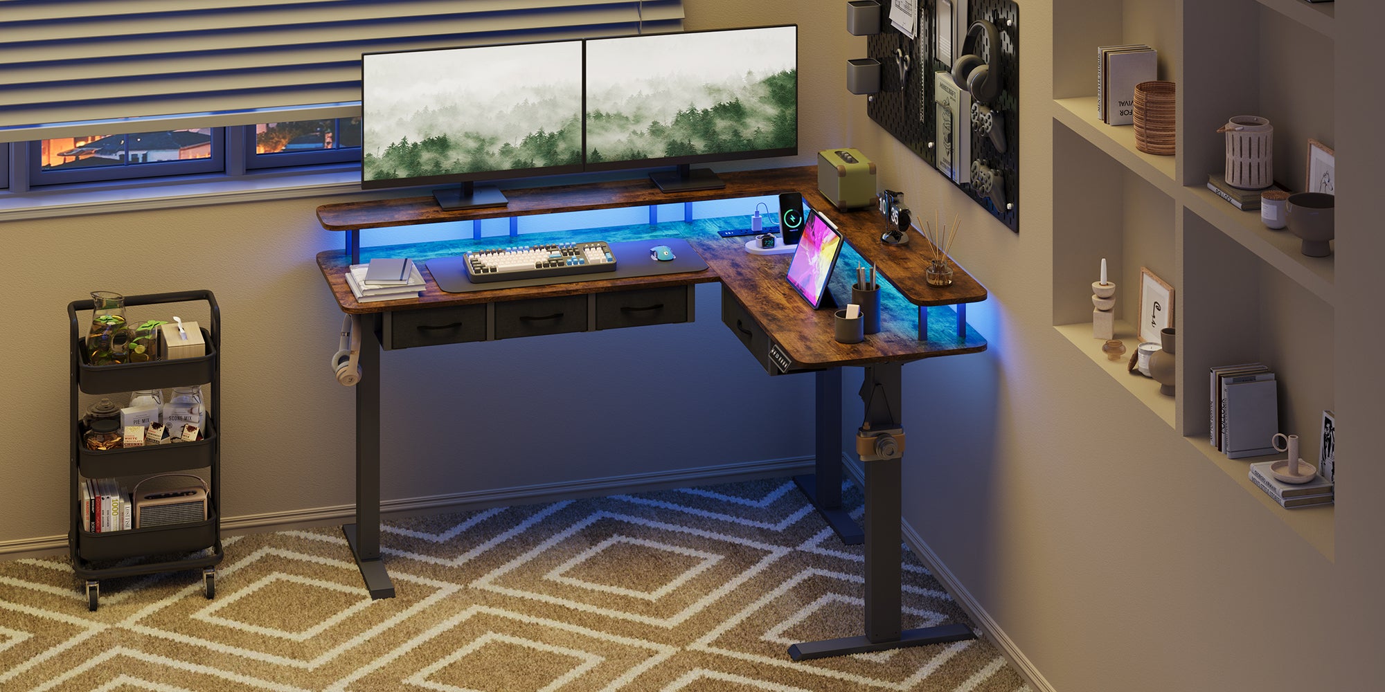 Vektaya CPT003 - BR Electric L Shaped Standing Desk with Drawers, RGB LED,Monitor Stand, Rustic Brown - VektayaFurnitureCPT003-BR