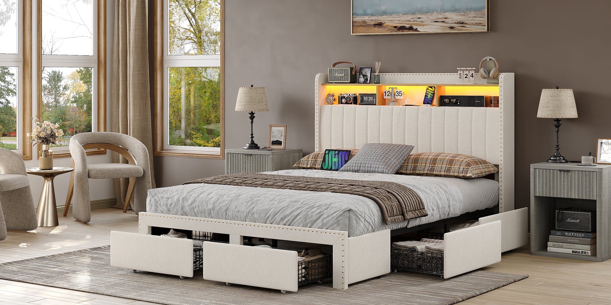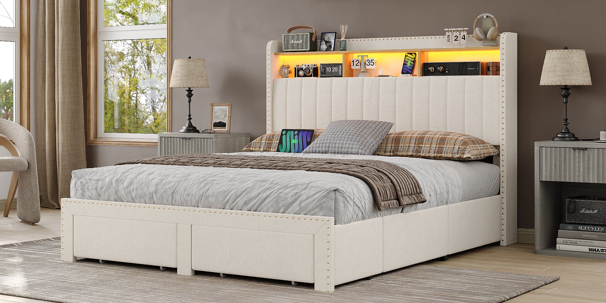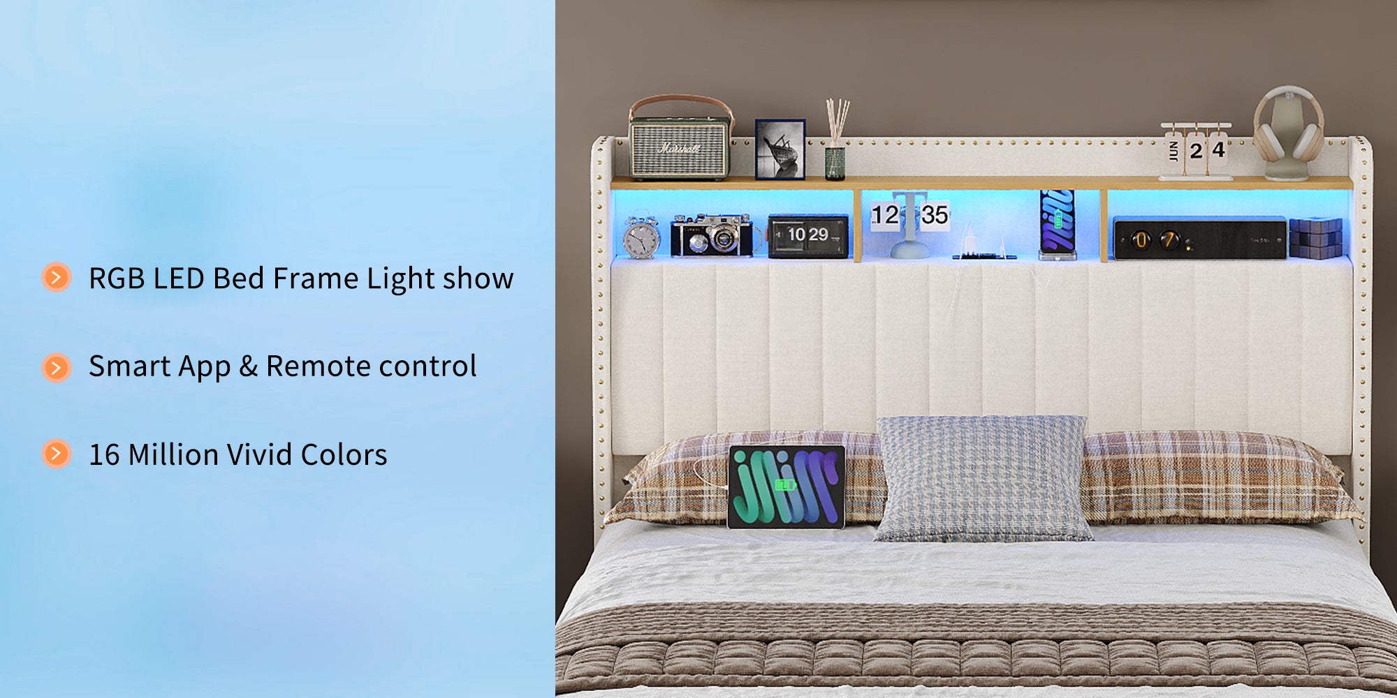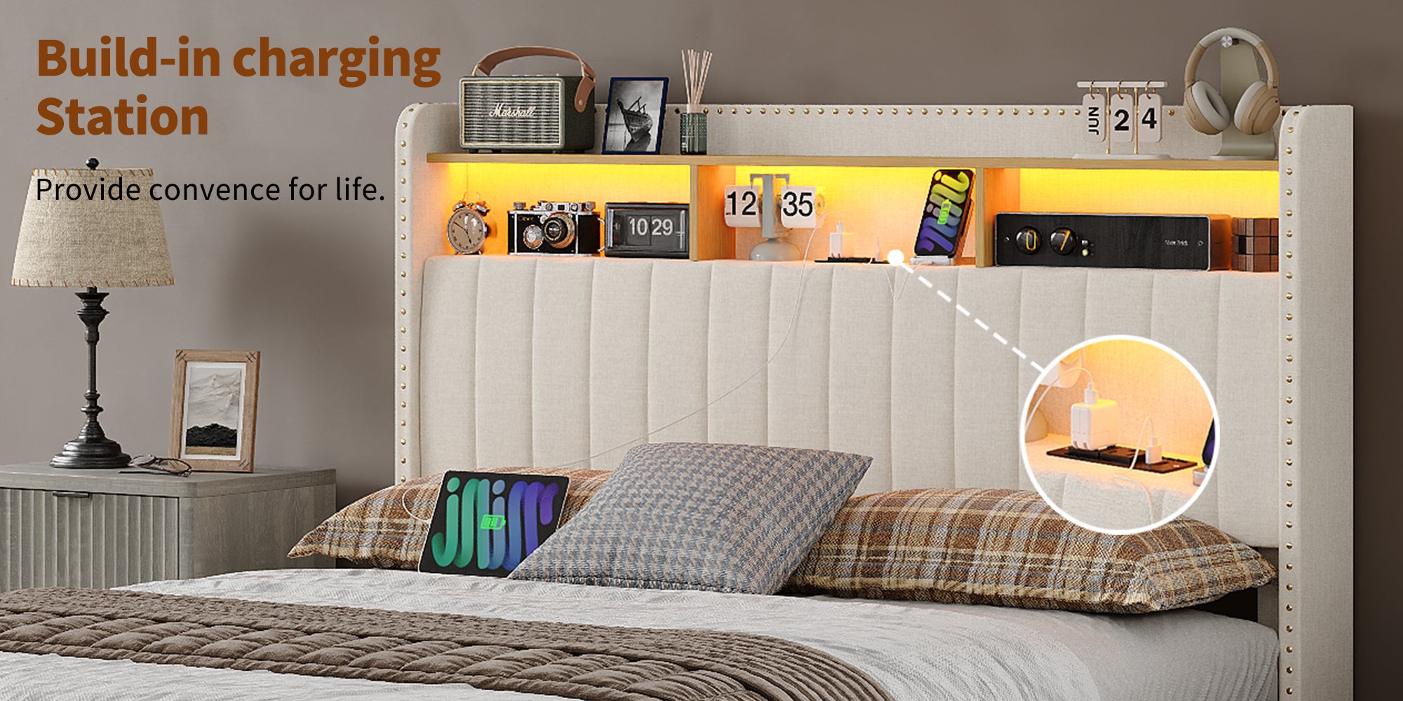 【Charging Station Headboard with Storage】: Featuring 2 AC outlets and USB ports, the bed frame caters to the power needs of devices like phones, laptops, lamps, and tablets. It enables convenient charging while keeping daily essentials such as phones, glasses, and books within easy reach and your bedroom tidy.