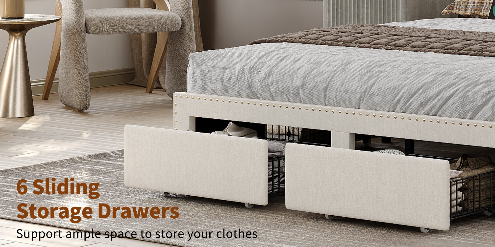 【6 Large-Capacity Storage Drawers】: This upholstered bed frame features 6 large storage drawers underneath, offering ample space for bedding, toys, and clothes to help maximize bedroom organization. Each drawer is equipped with 4 smooth-gliding wheels for easy push-and-pull access, keeping your room tidy and clutter-free.