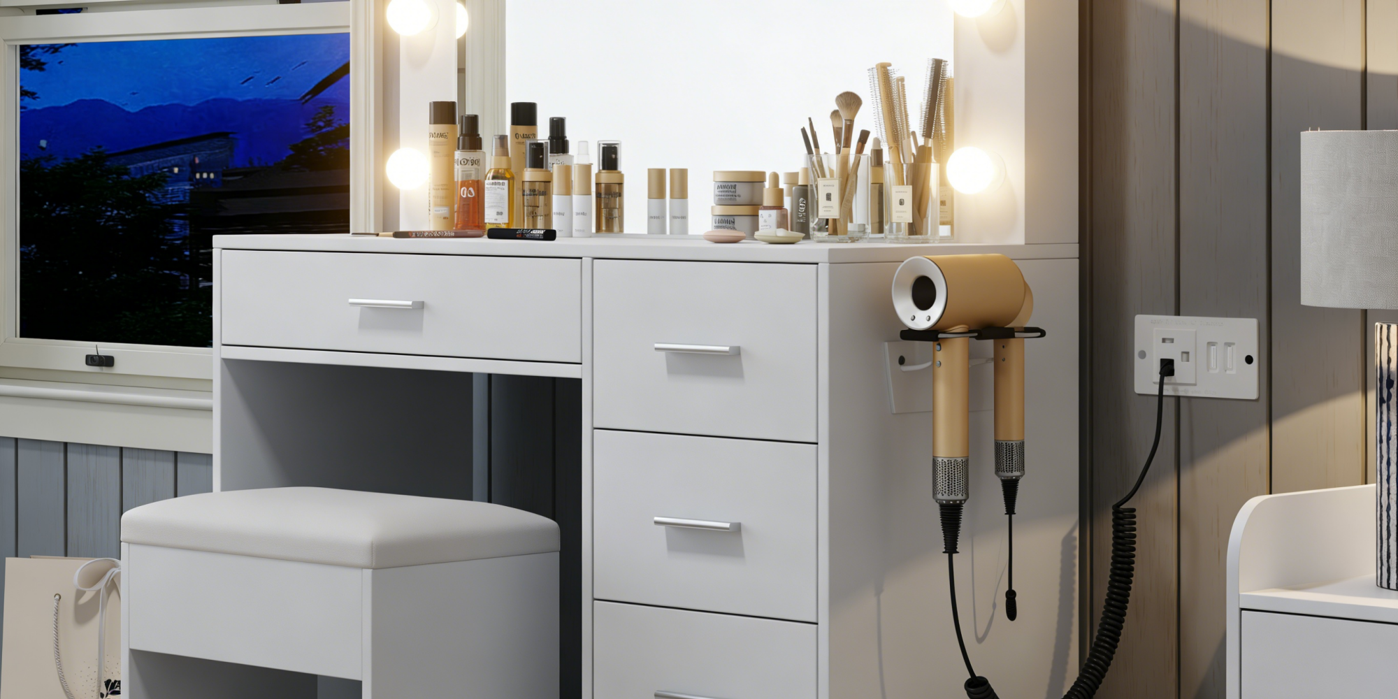 Vanity Table with charging station: This vanity table comes with a charging station and hair dryer holder, including 2 standard plug sockets and 2 USB ports, which can more conveniently connect hair dryers and curling irons, and can also provide power for your mobile phone, tablet or other devices to charge your mobile device, allowing you to take beautiful selfies after applying makeup