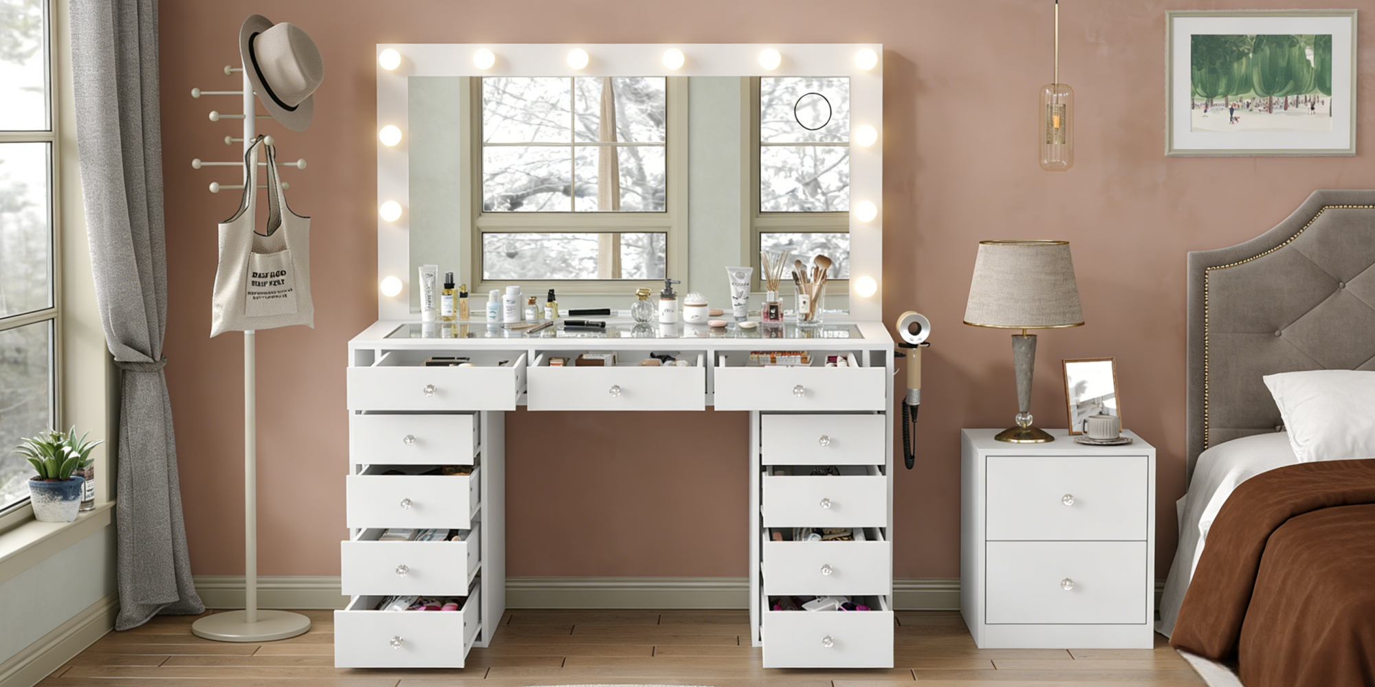 Vektaya US-VD010 Bedroom Makeup Vanity desk with LED MirrorLED Mirror, 11 Drawers