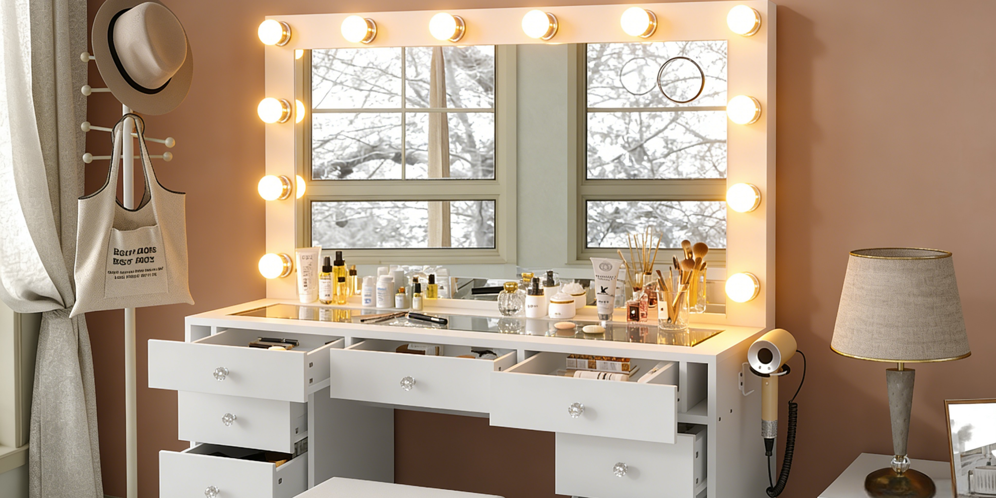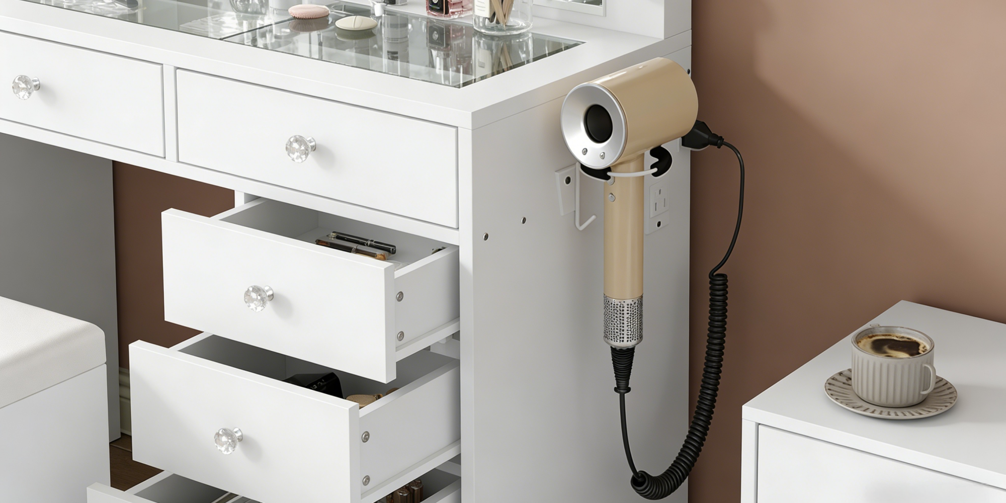 Vanity Table with Charging Station: Includes 2 plug sockets, 2 USB ports, and a hair dryer holder, allowing easy use of styling tools and convenient charging for phones, tablets, and other devices.