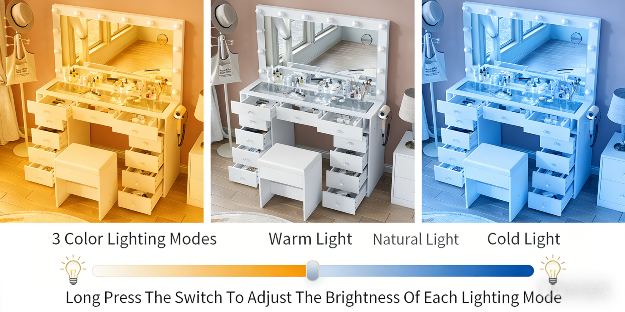 3 Lighting Modes & Brightness Adjustable: Equipped with an HD mirror and 12 Hollywood bulbs offering warm, natural, and cool modes with adjustable brightness, meeting various makeup needs at home, in salons, or during live streaming.