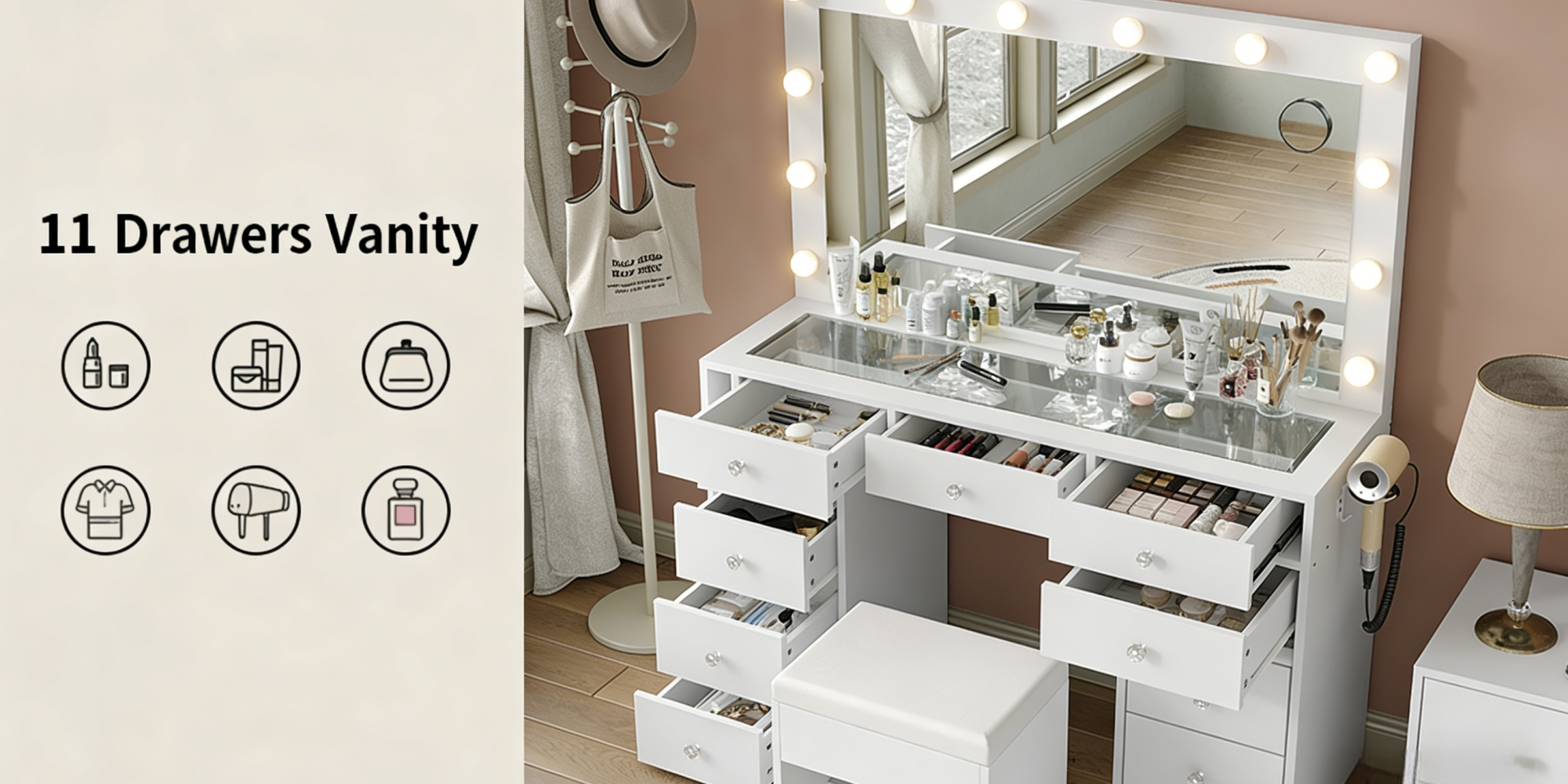 Storage Capacity: This vanity desk features 11 large metal sliding drawers that keep your cosmetics organized and provide ample space, helping your bedroom stay neat, tidy, and elegant.