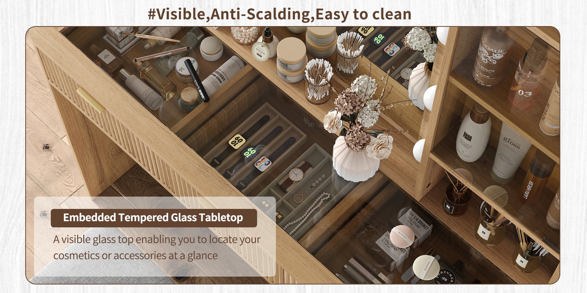 Spacious and Versatile: Our makeup vanity will solve all your storage problem. Glass tabletop allows you to appreciate the jewelry in the drawer at any time. 7 drawers can be classified to store various cosmetics and personal items. The storage cabinet is equipped with adjustable shelves, where you can store commonly used cosmetics and items