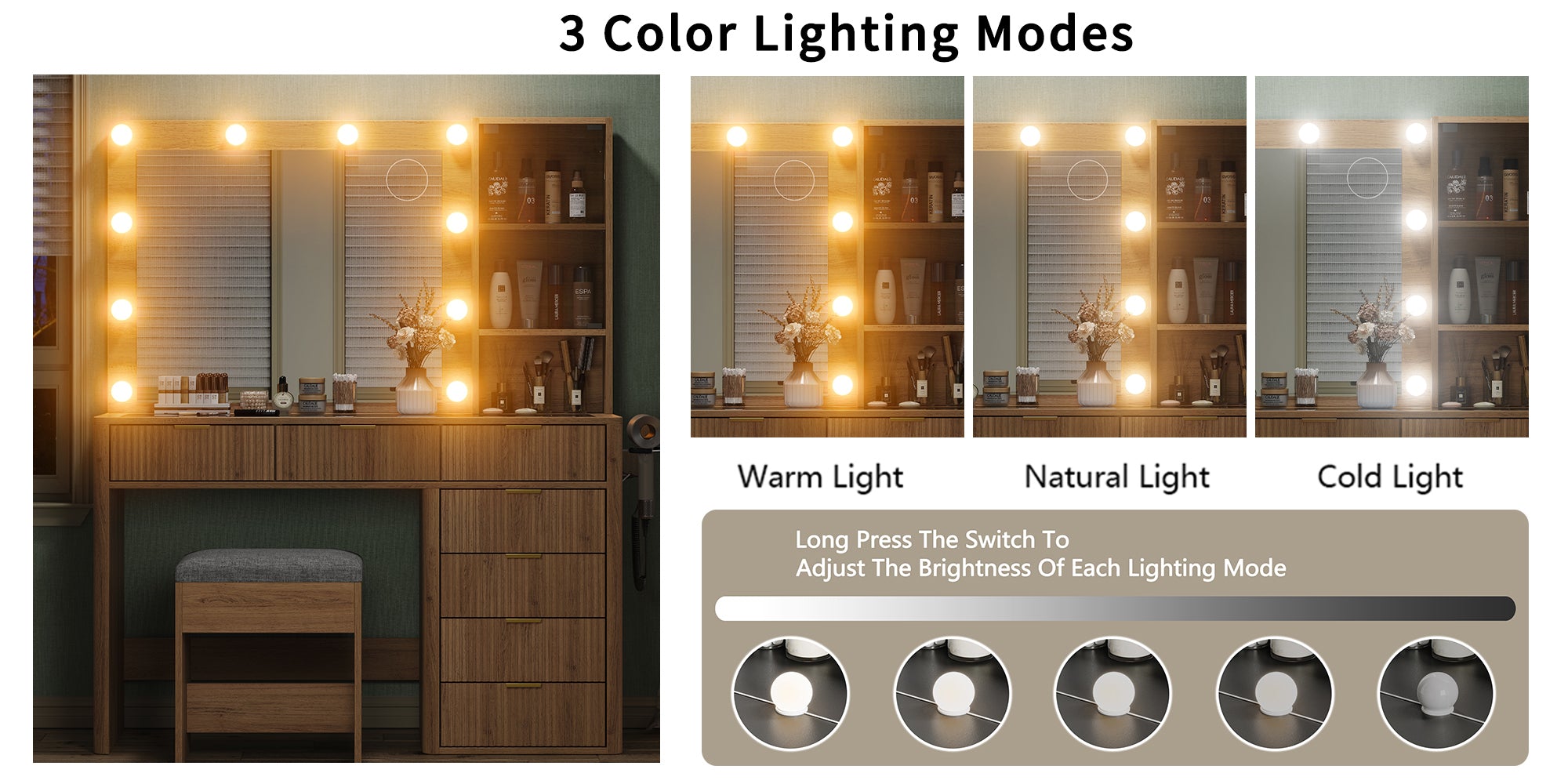 3 Brilliant Lighting Options: This vanity desk is equipped with a large mirror and 10 LED bulbs, provides 3 color modes (warm/natural/cool) and adjustable brightness. you can create the perfect ambiance for makeup application, live streaming, or vlogging in this vanity